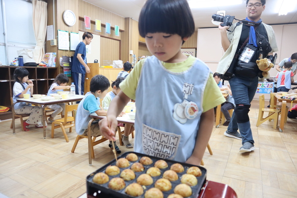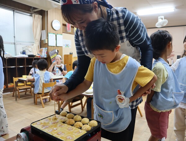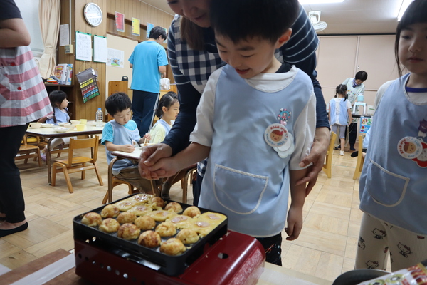 たこ焼きクッキング〜!1人1個ずつ卵を割ったよ〜なかなか上手だったね!