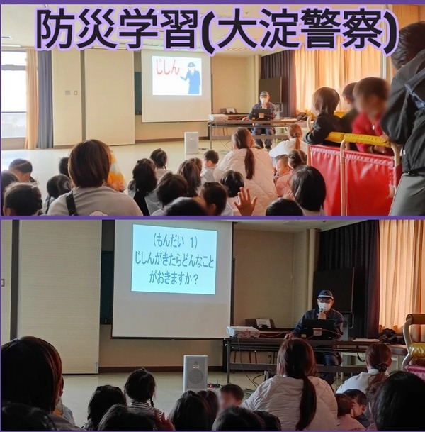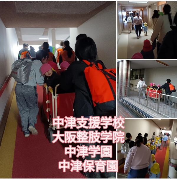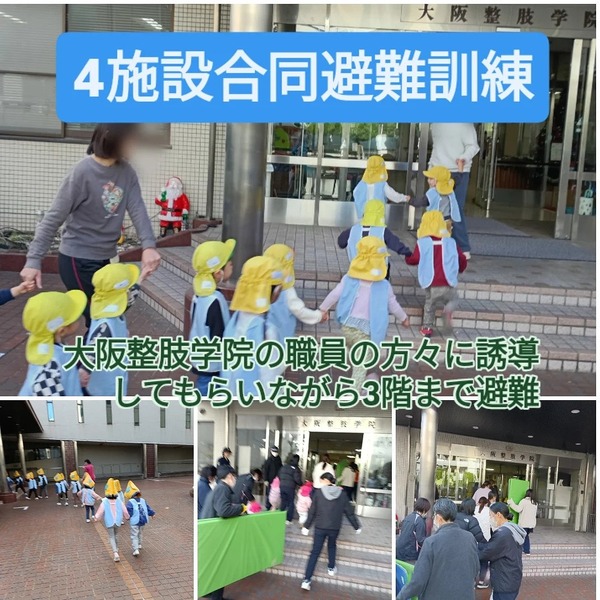 年に1回、地域の4施設合同の避難訓練を行っています。12/12(金)10時に地震発生〜非常ベルが鳴り5分間揺れます・・・それから避難開始。大淀警察の方や整肢学院の職員の方が各ポイントに配置、誘導してくださり「大阪整肢学院」の3階まで避難!途中「光徳寺善隣館中津学園」の方にもサポートしてもらいながら会議室に到着。人数確認後、大淀警察署の方による「防災学習」に参加しました。1つひとつ繰り返し経験を重ねながら園の安全体制を見直す機会にしていきたいです。「自助」「共助」を学び子ども達や自分の命を守る為にも職員の危機対応力を高める努力を続けていきたいです。