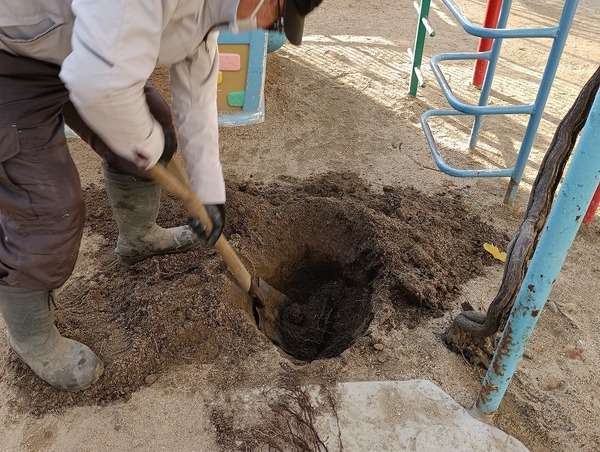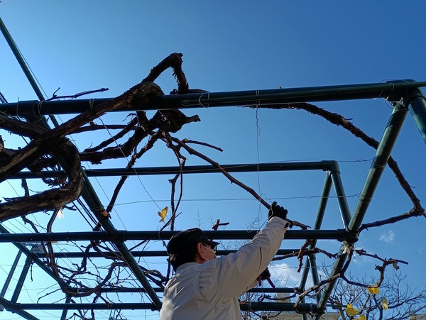 昨年は卒園児の保護者ボランティアの方に剪定作業をお願いし、その後も育て方のご指導を受けたおかげで、豊かな自然の恩恵に感謝したくさんの方々と喜びを共有出来ました。今年もその「ブドウの達人」が来園し剪定にご協力いただきました。また命の継承のためにも新しい苗木3本を植えてくださりました。改めて保育とブドウ作りには多くの共通点があるような気がいたします。土壌づくりが大切で自然の天候に左右され思うようにいかないこともありその都度柔軟に対応する力が求められます。私たちは環境を整え信じて待ち、必要な時にそっと支える存在でありたいと考えております。