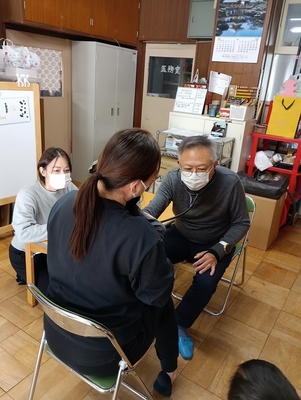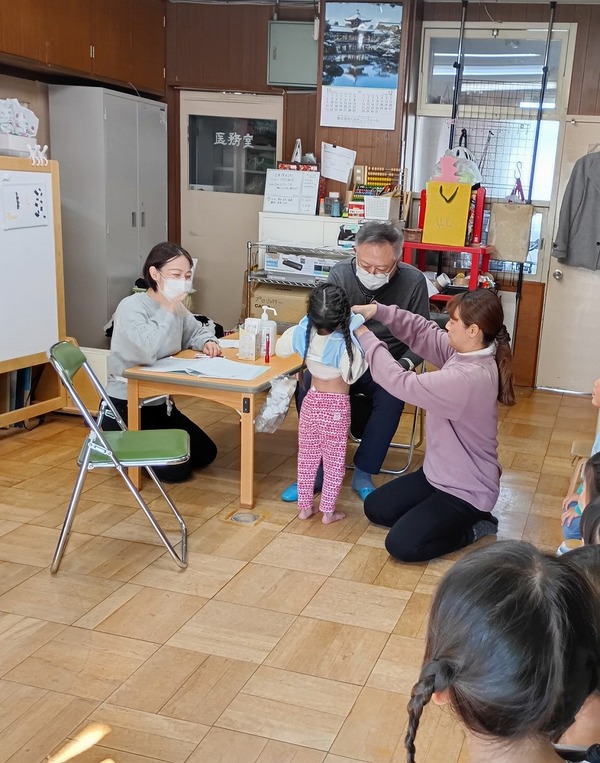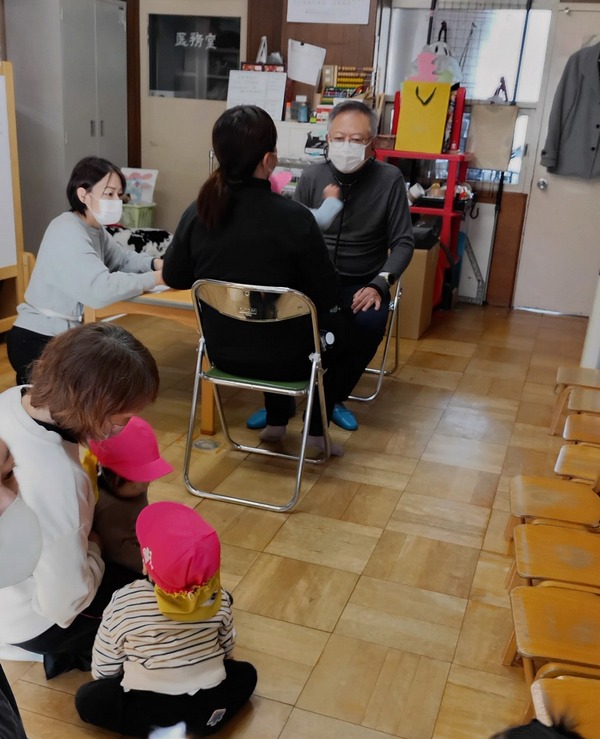 嘱託医(内科)吉本診療所の「吉本先生」・・・ドキドキしている子ども達に優しく「お名前は?」など話しかけてくださっていました。ほのぼの内科検診の1場面でした。