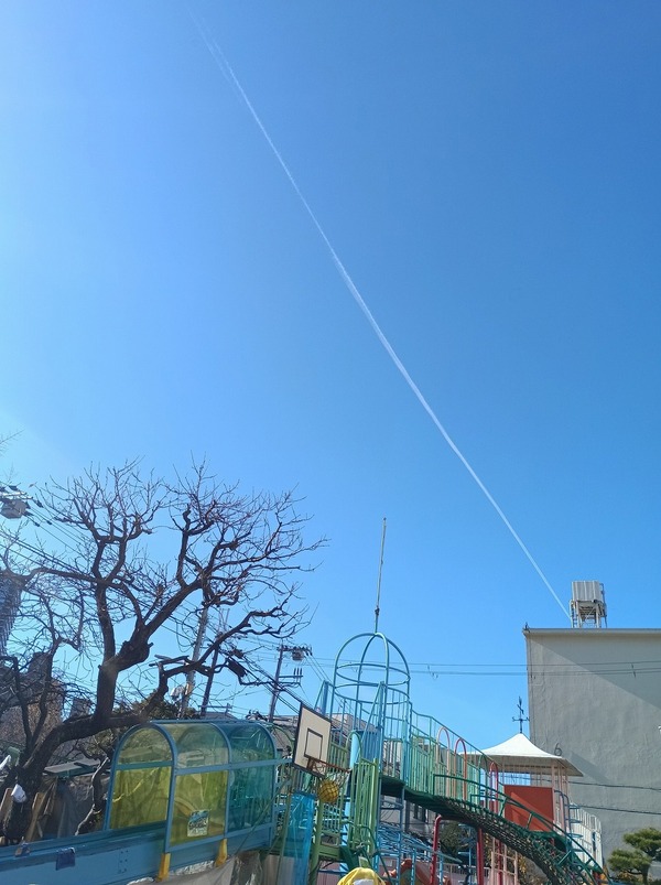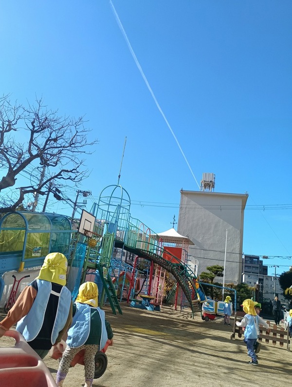 高い青空に「ひこうき雲」発見!気が付けば早速その場にしゃがみ込んで砂に描いていた子ども達の姿が印象的でした。