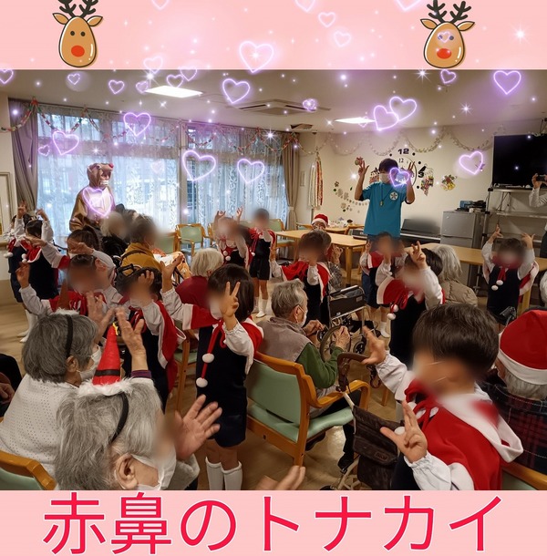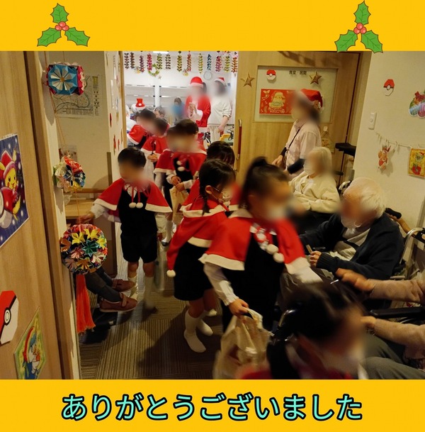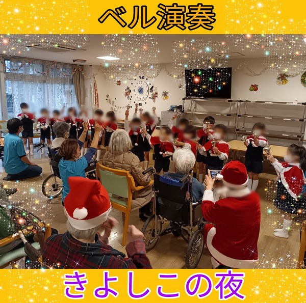 サービス高齢者住宅に居住されている方々との交流会・・・メリークリスマス!会場の可愛い装飾は、この日の為に手作りで準備くださったとのこと。「きよしこの夜」のベル演奏や「赤鼻のトナカイ」の手話歌を聞いていただきました。その後、参加者の皆さんと鈴やタンブリンで「ジングルベル」を奏でました。温かいおもてなしと今日の出逢いが、こども達にとってお金では買えない何よりも素敵なプレゼントだったと思います。お招きくださりありがとうございました!