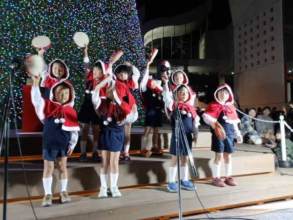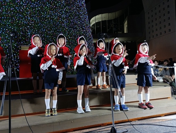 新梅田シティクリスマスツリー点灯式に参加しました。「ジングルベル」の曲に合わせて楽器遊び〜「赤鼻のトナカイ」の手話歌を披露しました。