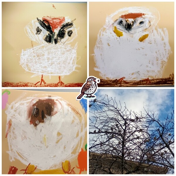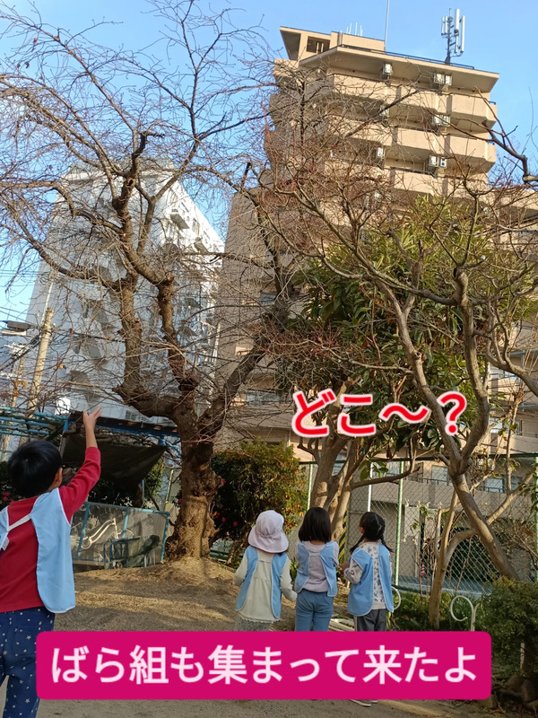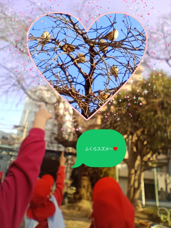 | 「ふくら雀」とは、寒い時期にスズメが羽毛を膨らませて丸くなっている姿を指す言葉です。ゆり組の子ども達が雀を見つけて「ふっくらスズメやぁ」と嬉しそうに園庭を走り回っていました☆ | ||