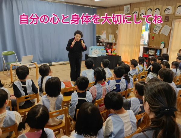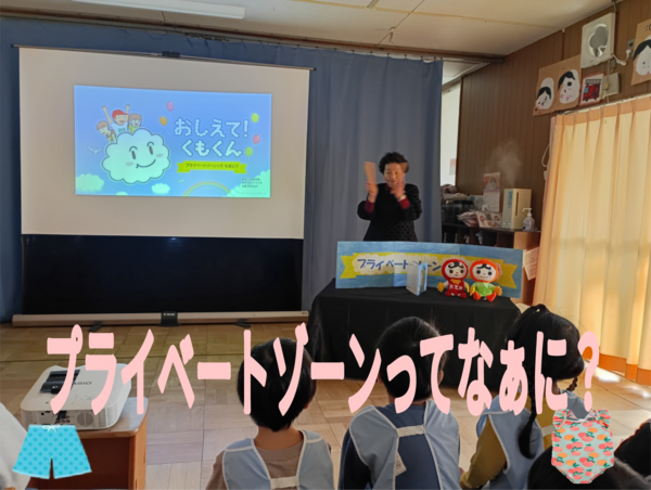 | 「こども人権教室」・・・大阪第1人権擁護委員会の方によるこども人権教室に4・5歳児が参加しました。就学前の子ども達に対して、性被害から守る道へと導くために「生命の安全教室」に3年前より取り組んでいます。今現在の私たちを取り巻く環境が、こどもの人権を守る安心で安全な場所になっていくことを願い続けながら、これからも丁寧に向き合っていきたいと思っております。 | ||