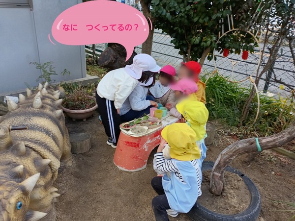 | 1月のある1日の風景です!リトミック講師の下野先生と一緒にタンブリン遊びを楽しんだすみれ・ちゅうりっぷ組さん。頭に乗せたり車のハンドルにして走ったり曲に合わせて身体を動かしました。また、園庭では・・・とても可愛くて微笑ましい場面〜メダカの広場に居る恐竜さんにごちそうを作りながら異年齢児で遊びを広げていました。 | ||